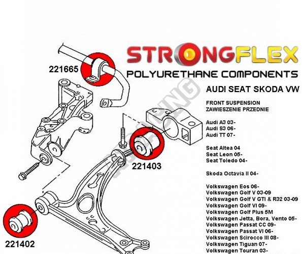 Škoda Octavia II StrongFlex Sport (tvrdosť 90ShA) kompletná zostava silentblokov na celé auto obsahuje:
