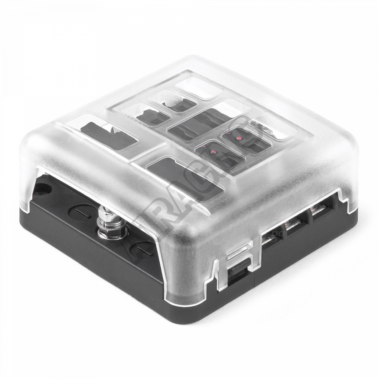 Univerzálna poistková skrinka 6-obvodová plus navyše lišta hmoty. V prípade prepálenia poistky sa rozsvieti červená LED dióda nachádzajúca sa pri každej zásuvke, vďaka čomu je možné rýchlo a bez problémov určiť, na ktorom obvode je porucha.