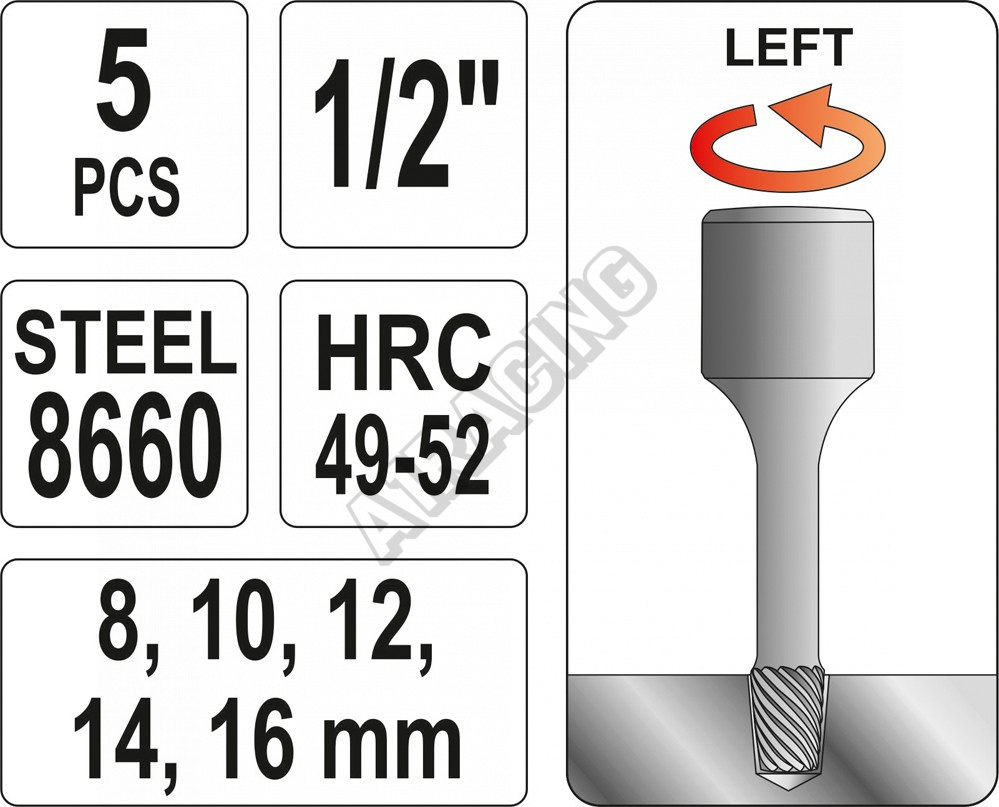 Sada obsahuje 5 ks přípravků na závrtné šrouby průměrů 8; 10; 12; 14; 16 mm.