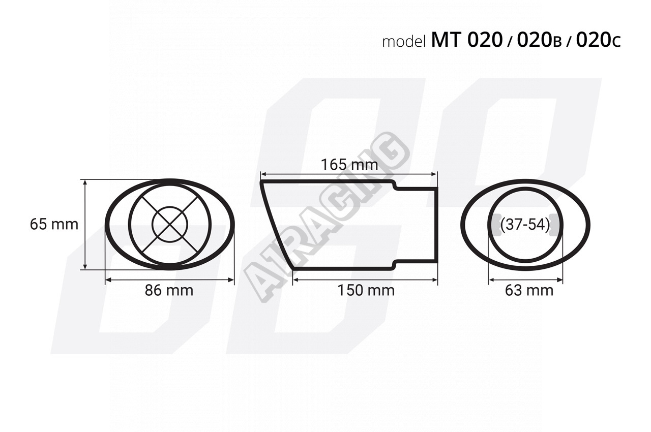 Efektné titánové prevedenie s dvojitým plášťom koncovky proti prehriatiu hornej vrstvy, dĺžka 165 mm, vonkajší priemer koncovky 86x65 mm, priemer pre uchytenie je 37-56 mm na spony. Ak by ste chceli koncovku navariť, tak môže byť použitá až pre priemer výfukovej trubky 60 mm.