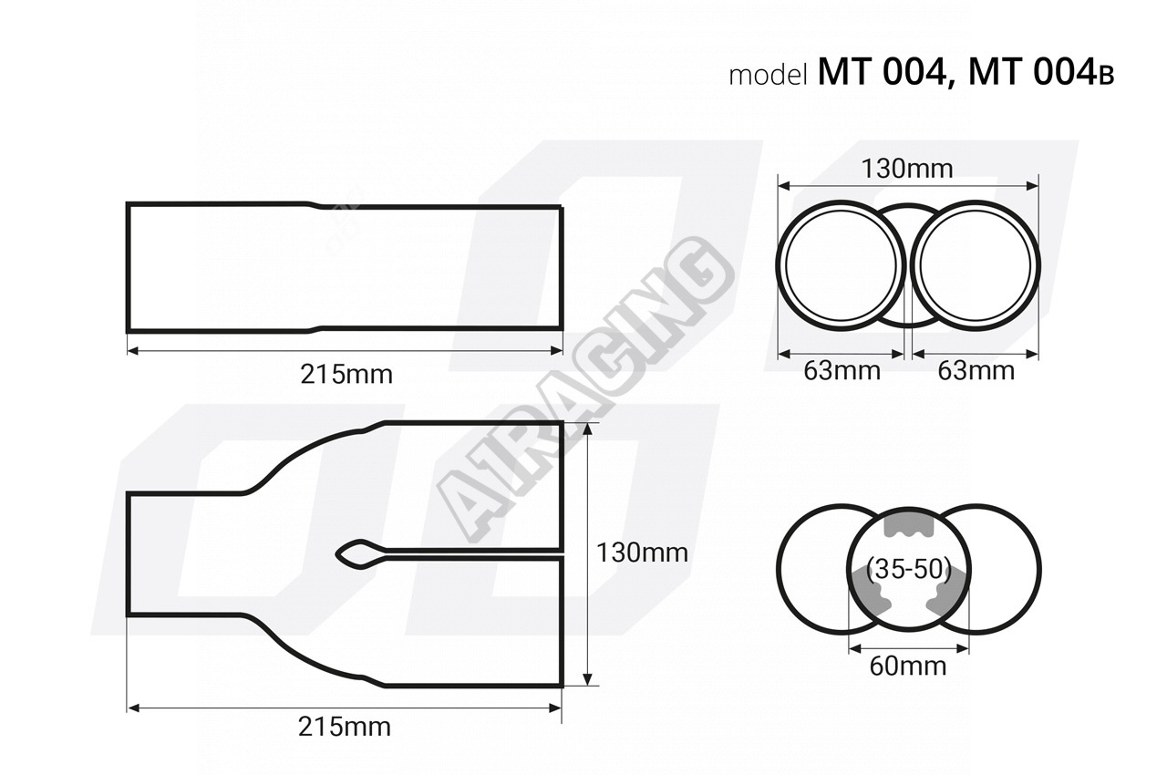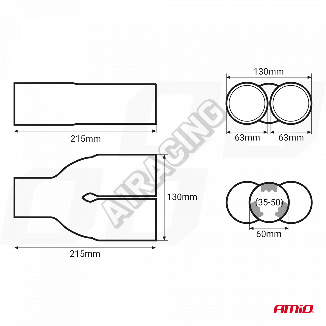 Rozmery výfukovej koncovky: dĺžka 230 mm, priemer koncovky 2 x 63 mm, priemer pre nasadenie 35-50 mm, pre navarenie až 60 mm