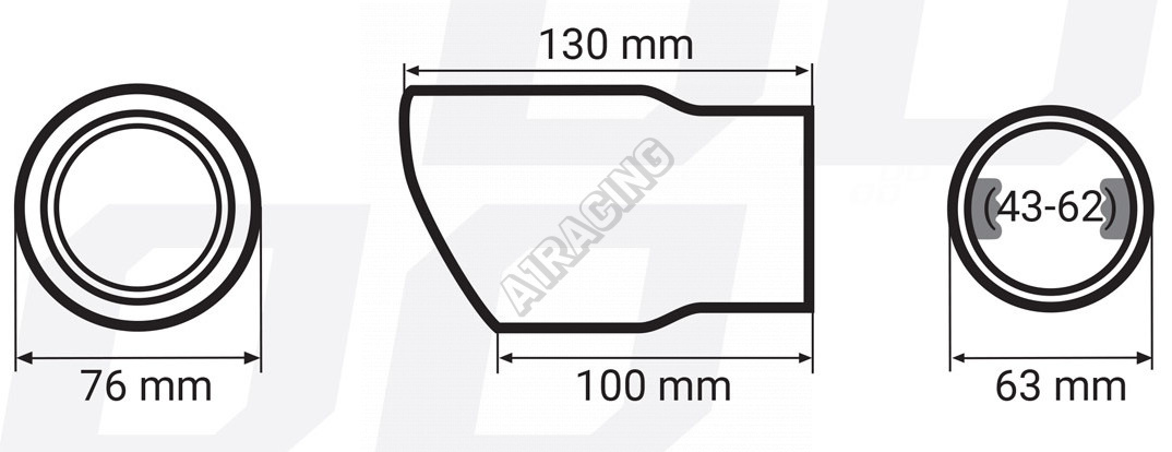 Efektné titánové prevedenie s dvojitým plášťom koncovky proti prehriatiu hornej vrstvy, dĺžka 130 mm, vonkajší priemer koncovky 76 mm, priemer pre uchytenie je 43-61 mm na spony. Ak by ste chceli koncovku navariť, tak môže byť použitá až pre priemer výfukovej trubky 63 mm.