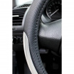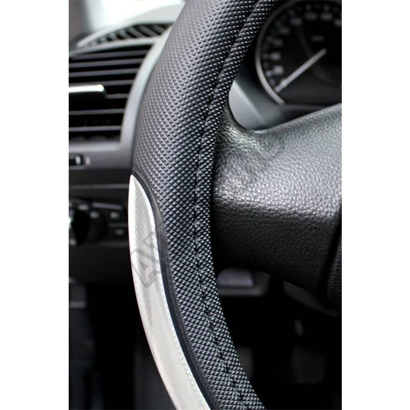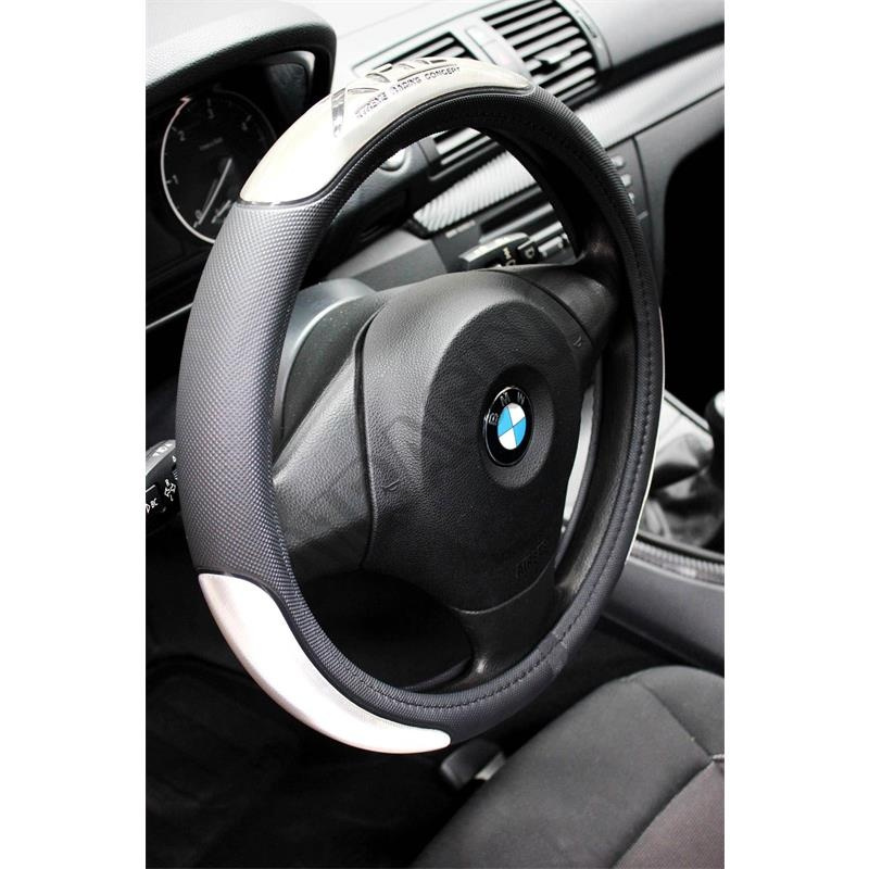 Čierny poťah volantu so strieborným polkruhovým detailom na každej strane. Priemer 37 až 39 cm umožňuje byť univerzálnym poťahom pre akýkoľvek typ auta, súčasťou sú návlkeky pásov so suchým zipsom na zadnej strane, aby bolo zaručené usadenie. Táto sada dodá vášmu vozidlu kompletný športový vzhľad.