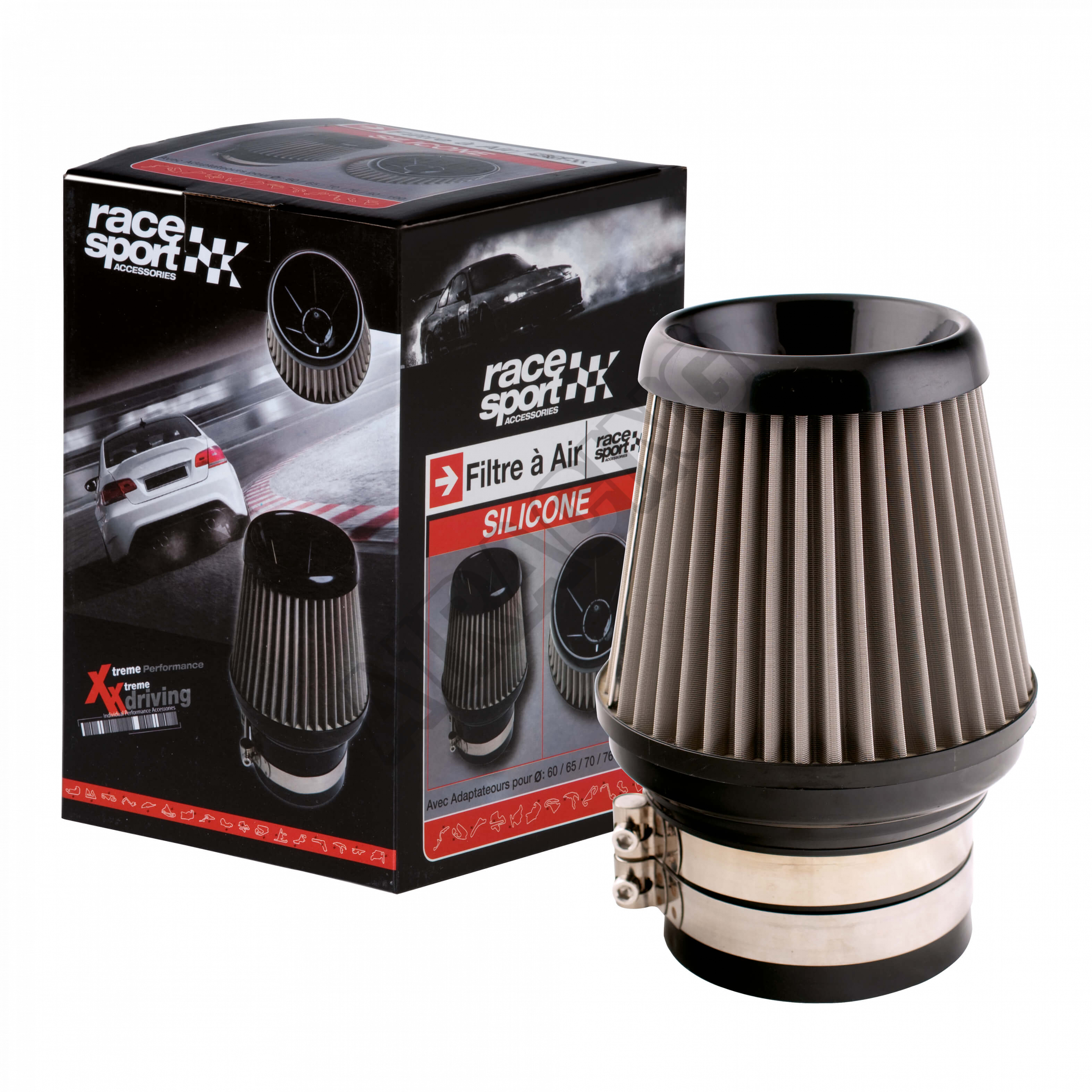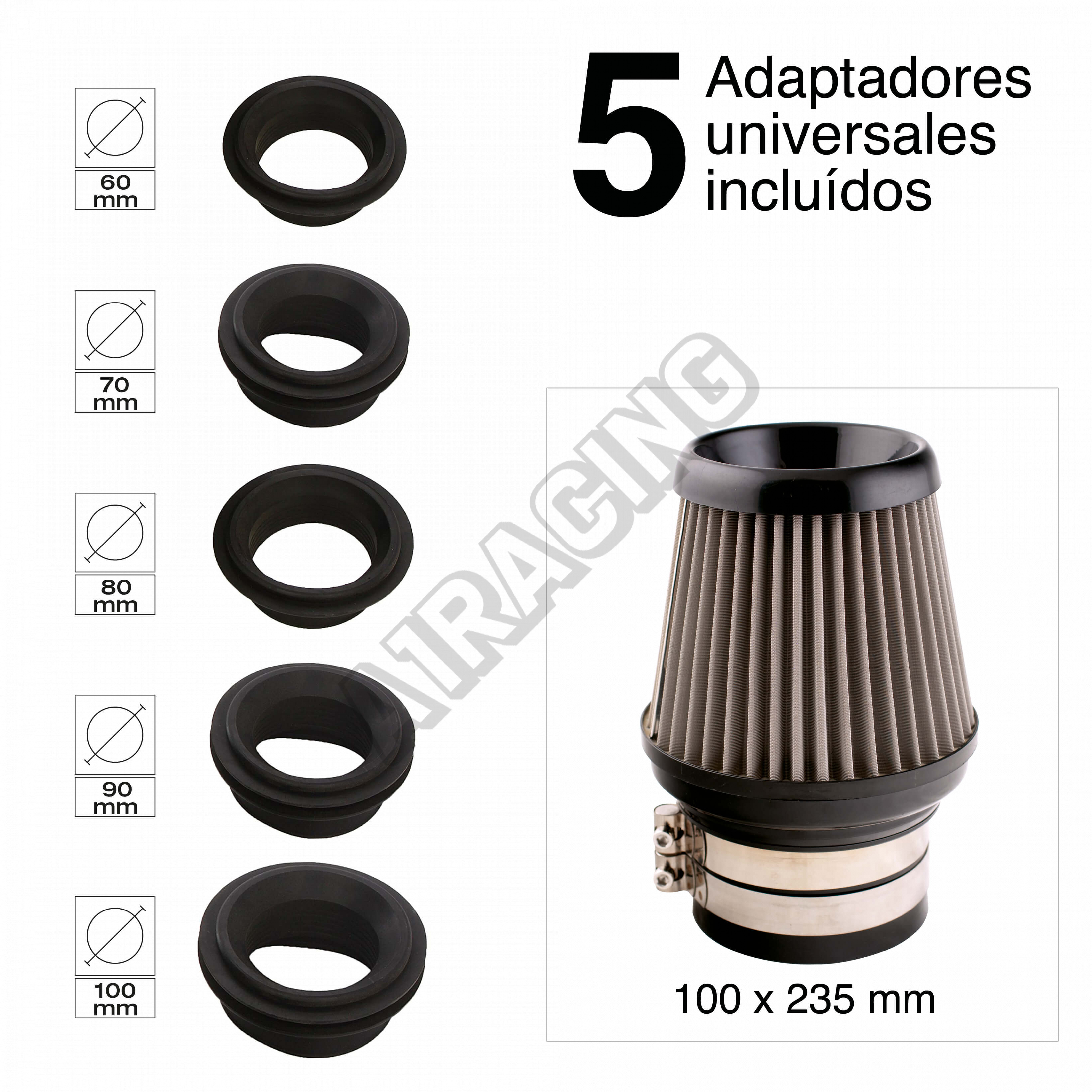 Univerzálny športový vzduchový filter kužeľový - filtrácia je z jemného nerez drôtu. Zlepšuje prúdenie vzduchu, decentne spôsobuje zvýšenie výkonu a tiež zlepšuje športový zvuk motora. Vyznačuje sa dlhou životnosťou. Inštalácia na sponu je veľmi jednoduchá Rozmery: Výška - 235 mm Šírka spodnej - 165 mm Šírka horný - 155 mm, priemer pre nasadenie 100, 90, 80, 70 a 60 mm (5 adaptérov).