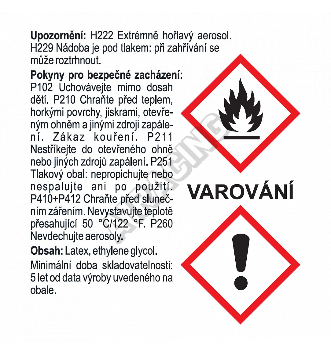 Návod k použití: 1. Pokud je to možné odstranit předmět, který způsobil propíchnutí. 2. Nastavte kolo ventilkem nahoru. 3. Důkladně protřepte sprej před použitím. 4. Našroubujte hadičku spreje na ventilek. 5. Držte sprej vzpřímeně a zatlačte na spouštěč spreje. 6. Pneumatika se nafoukne a utěsní za 1-3 minuty. 7. Uzavřete ventilek kola a ihned se rozjeďte, aby se přípravek v kole rovnoměrně rozprostřel (ujeďte minimálně 3-5 km). Takováto oprava jen pouze dočasná (pro nouzové dojetí k pneuservisu). Pneumatiku je třeba následně odborně opravit. V pneuservisu informujte obsluhu o použití tohoto přípravku.