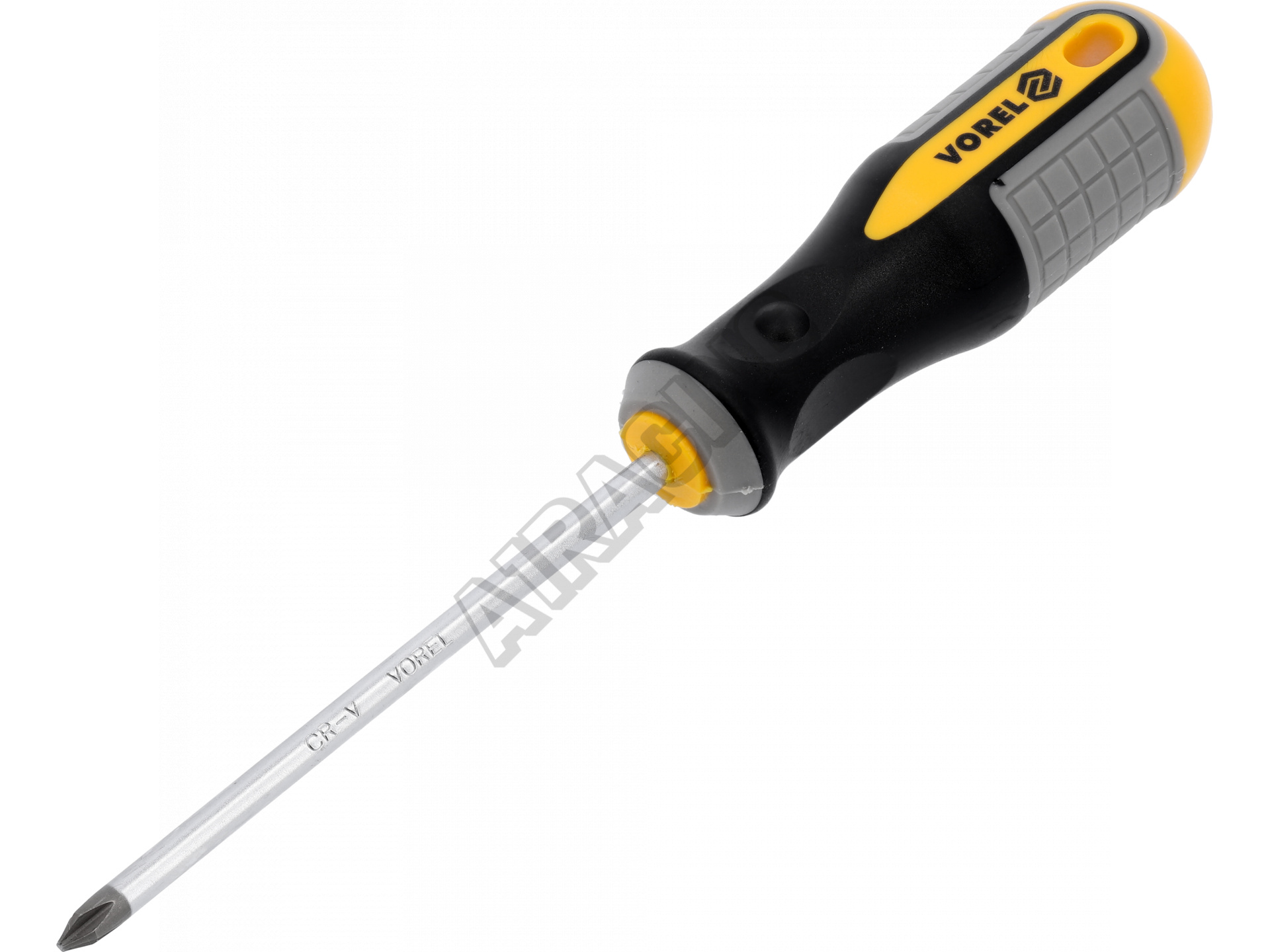 Křížový šroubovák PH1 x 100 mm. Vyrobeno z chrom-vanadiové CrV oceli. Špička má saténový povrch, dodatečně pískovaná a magnetizovaná, což umožňuje pevné uchopení hlavy šroubu. Rukojeť je vyrobena ze dvou kompozitního plastu. Otvor v rukojeti umožňuje zavěsit šroubovák.