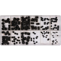 Sada 160 ks bezhlavých, imbusových šroubů. Vše je přehledně uspořádáno v kompaktním plastovém kufřík