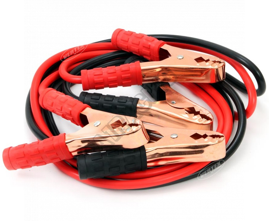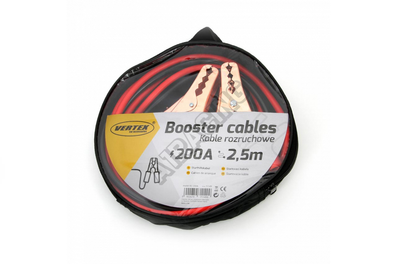 Medené, farebne označené štartovacie káble so svorkami na akumulátor. Max. prúd 200 ampérov, dĺžka 2,5 metra a prierez je 3mm2.