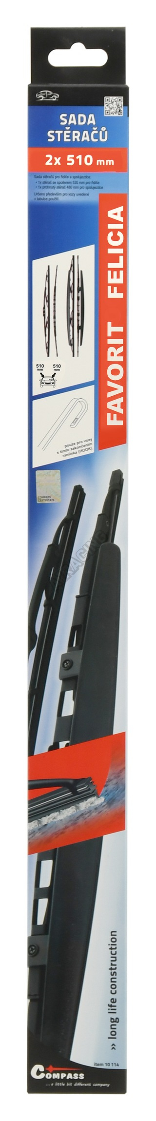 Sada dvou stěračů (řidič + spolujezdec), optimalizovaná pro vozy Škoda Felicia. Stěrač určený k montáži před řidičem se spoilerem. Stěrač určený k montáži před spolujezdcem je prohnutý. Zajišťuje dokonalé stírání i na zakřivené části skla na straně spolujezdce. Kvalitní vícevahadlová nýtovaná konstrukce ramena stěrače. Balení obsahuje stěrač se spoilerem 510 mm (20") + stěrač 510 mm (20") + univerzální adaptéry pro montáž.