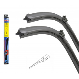 Sada dvou plochých stěračů FLAT (řidič + spolujezdec) se speciálním uchycením. Délky stěračů a systé