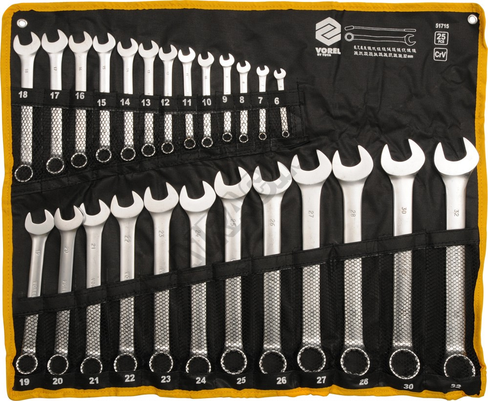 Sada kľúčov očkoplochých 25 ks 6 - 32 mm vyrobená z kvalitnej CrV ocele, uložená v prehľadnom odolnom puzdre zo silnej syntetickej tkaniny.