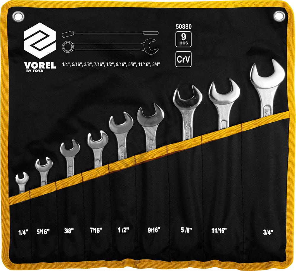 Kľúče očkovo-ploché sada 1/4" - 3/4" 9 kusov je sada klasických očkoplochých kľúčov s palcovými (Inch) rozmermi. Kľúče sú vyrobené z kvalitnej chrómvanádiovej zliatiny ocele, s čiastočne lešteným a satinovaným povrchom. Puzdro je z pevnej syntetickej tkaniny.