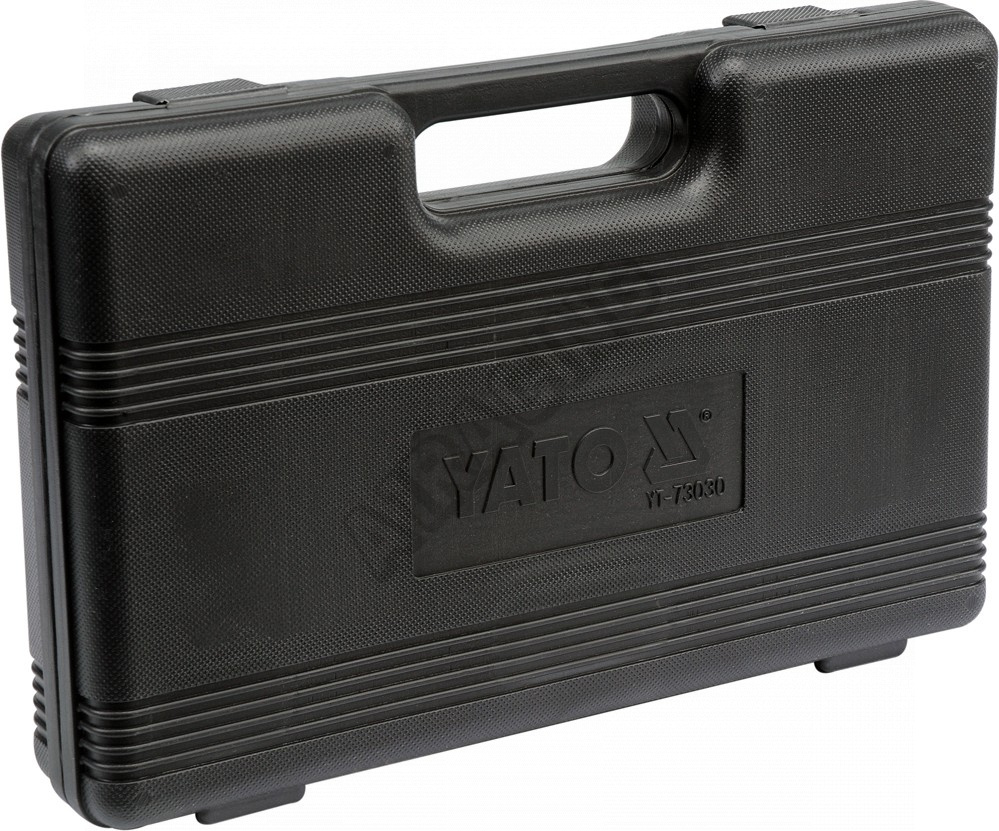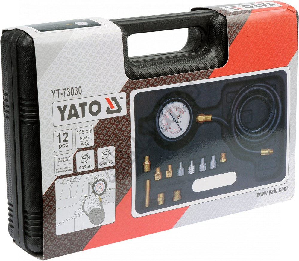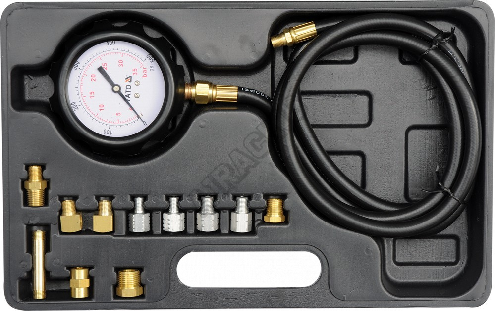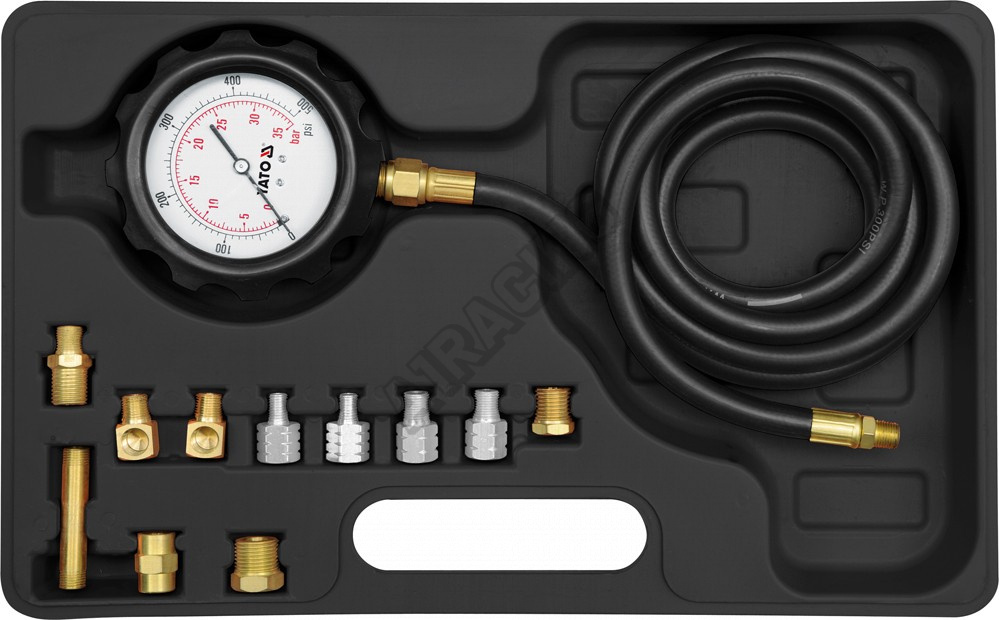 Profesionálny tlakomer oleja YATO. Dodáva sa s 12 redukciami na prispôsobenie rozchodu u väčšiny mot