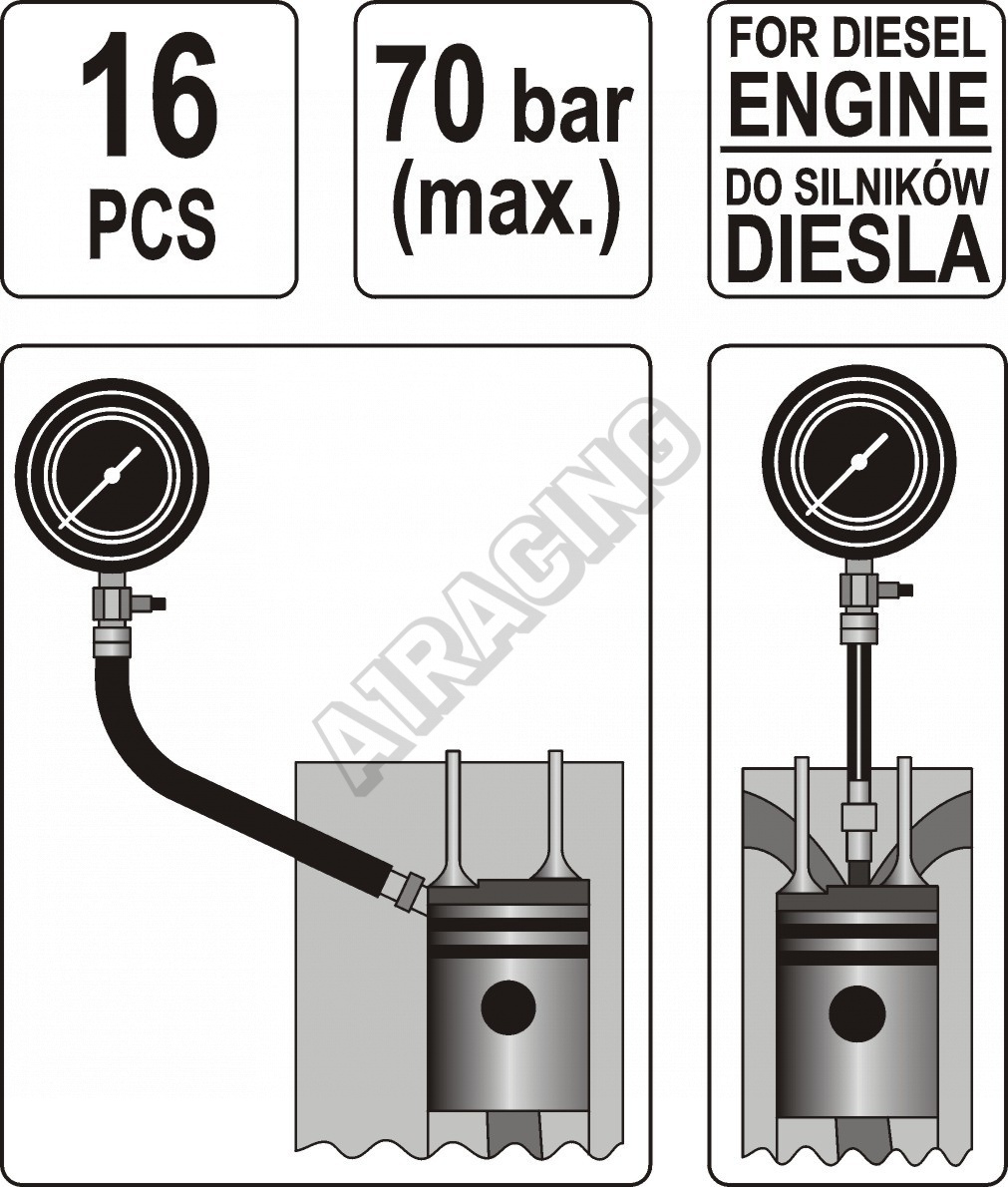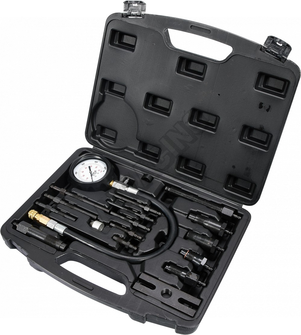 Na meranie kompresie Dieselových motorov max 70 bar. Súprava obsahuje adaptéry pre pripojenie merača k väčšine motorov bežných značiek automobilov.