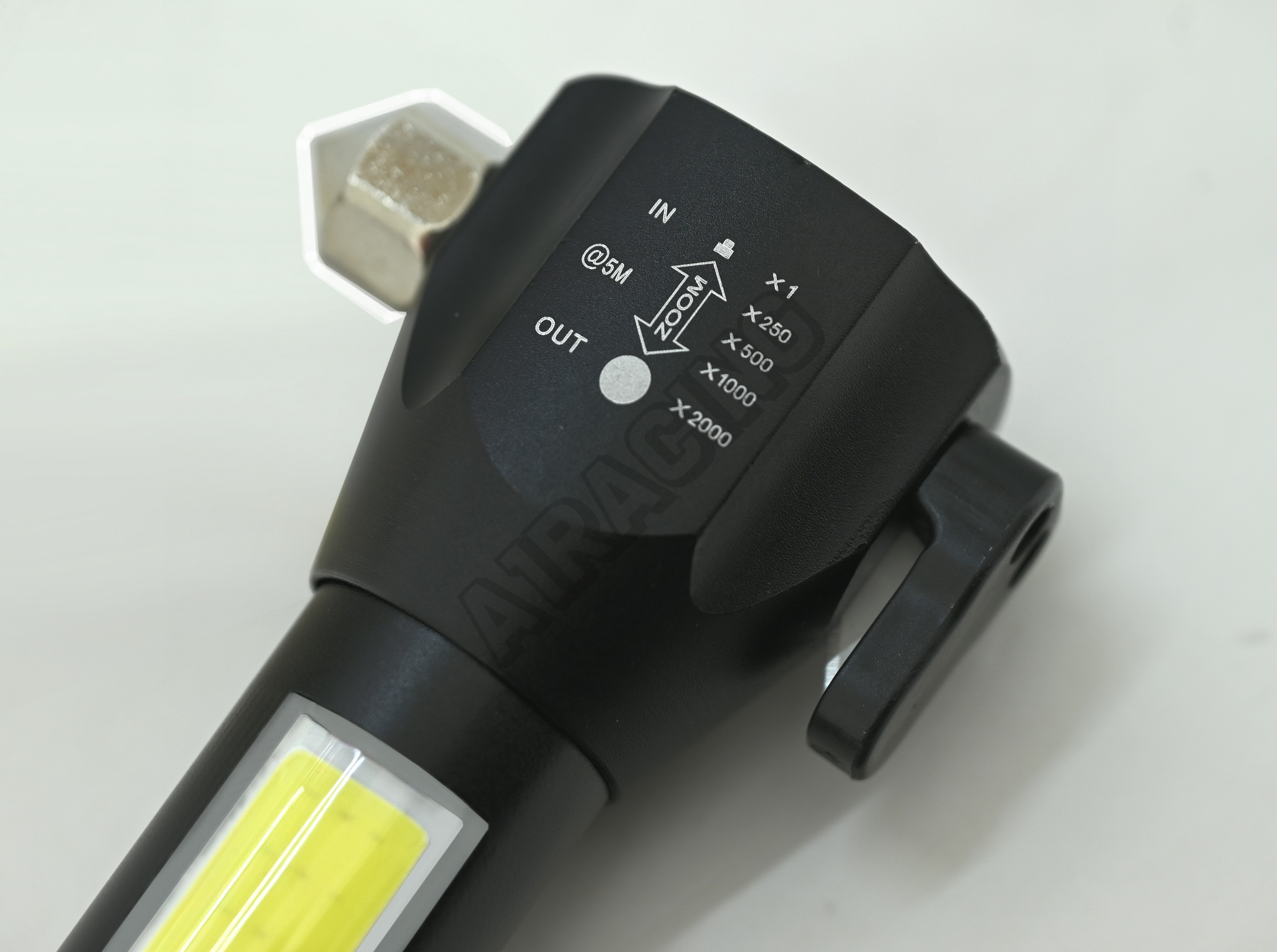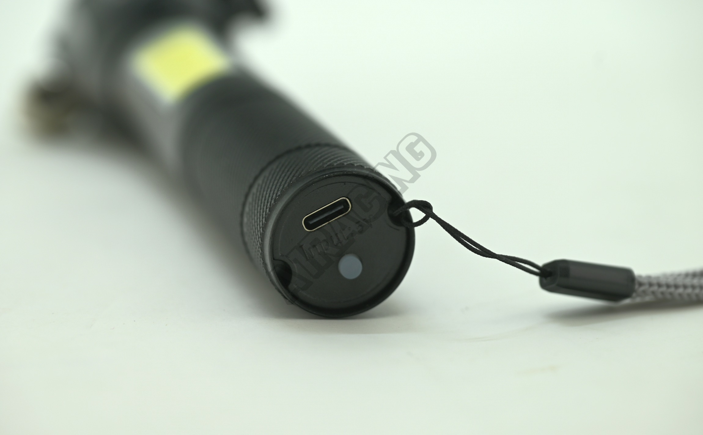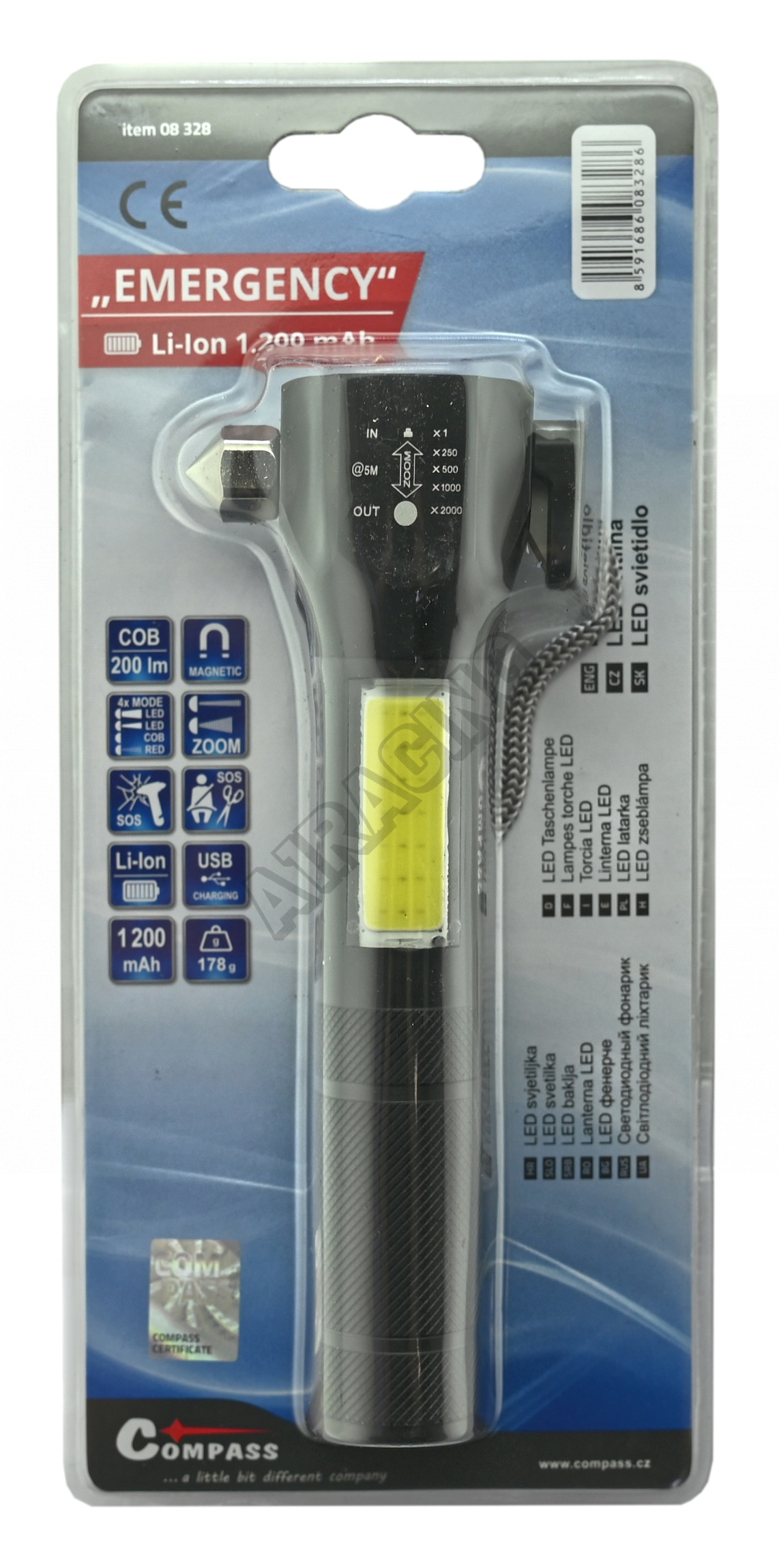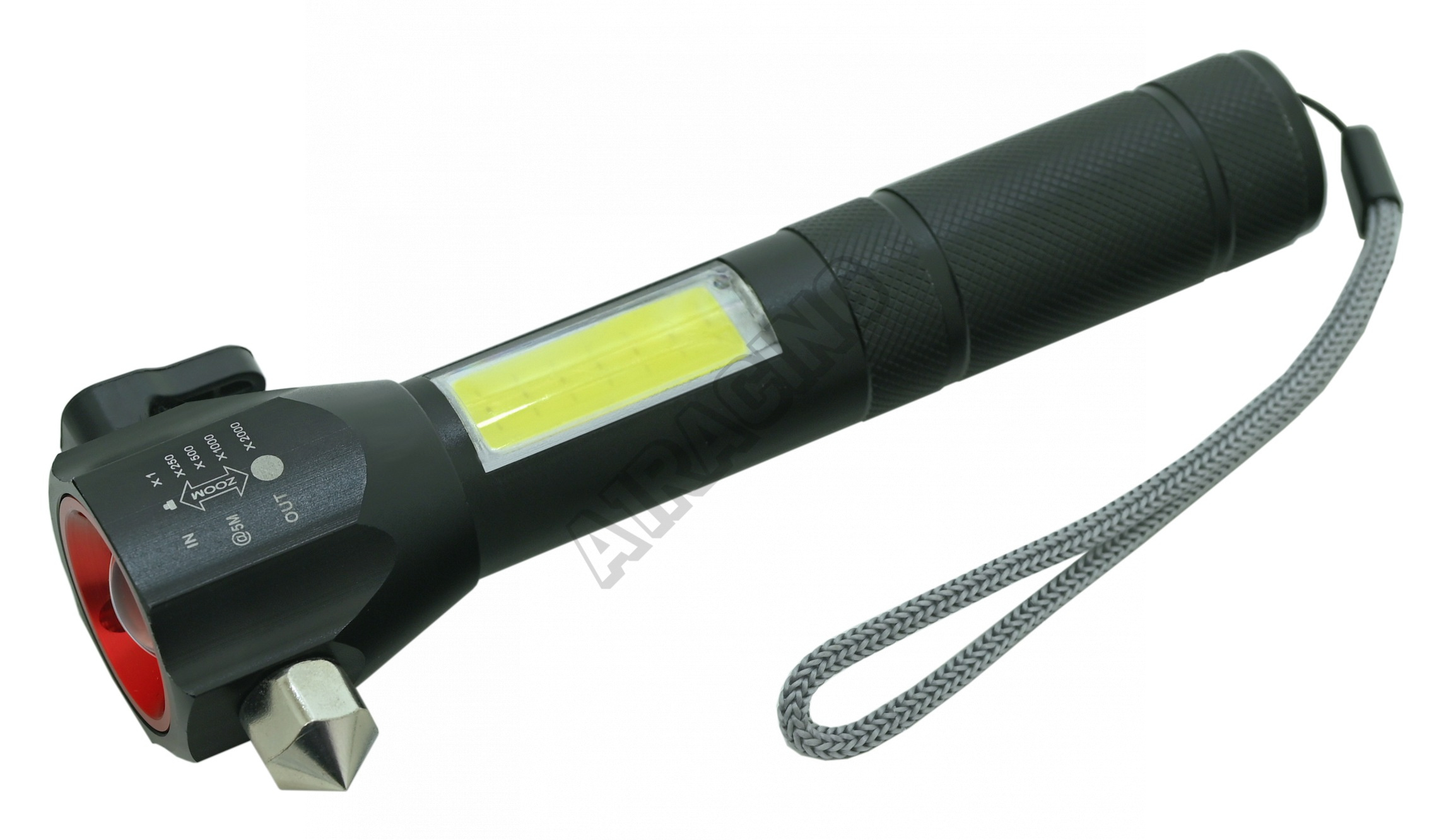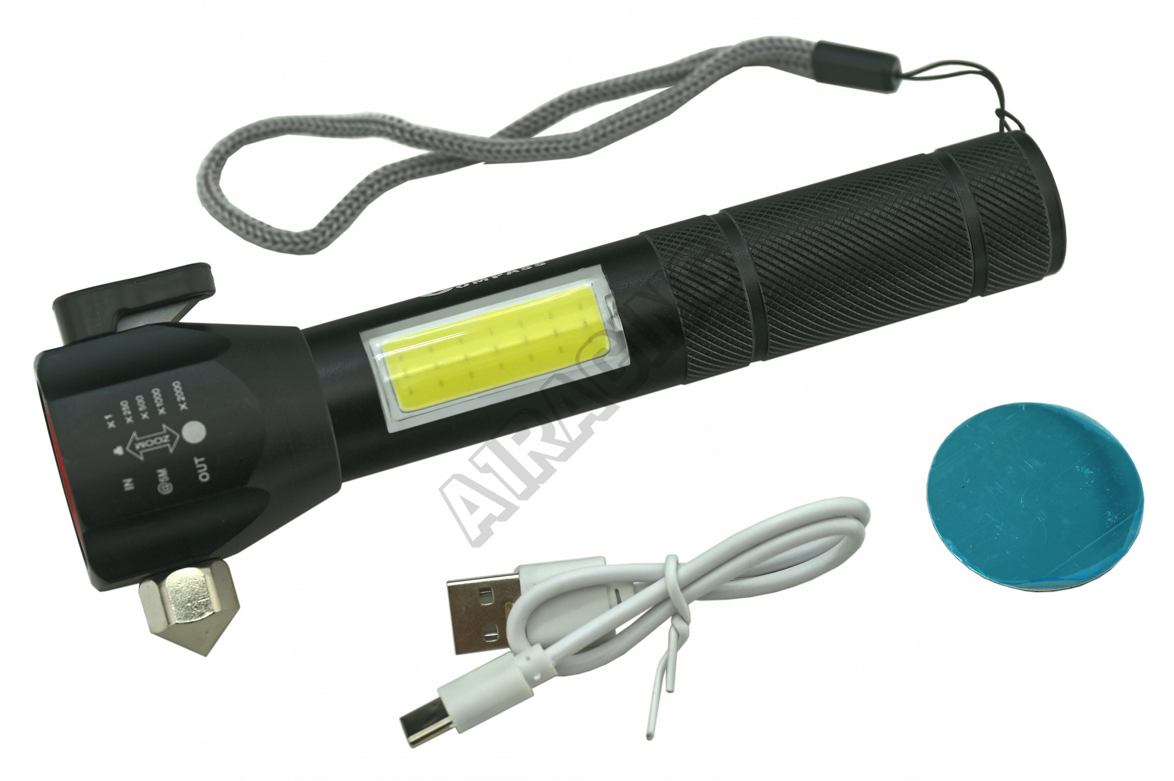 Dobíjecí LED lampa s čelním osvětlením s funkcí zoom, bočním rozptýleným COB osvětlením a užitečnými nouzovými funkcemi.