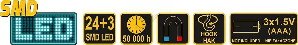 Napájení 3x AAA baterie (LR03, nejsou součástí balení). Svítilnu lze snadno upevnit vestavěným magnetem na zadní straně, nebo zavěsit na zabudovaný výklopný háček.