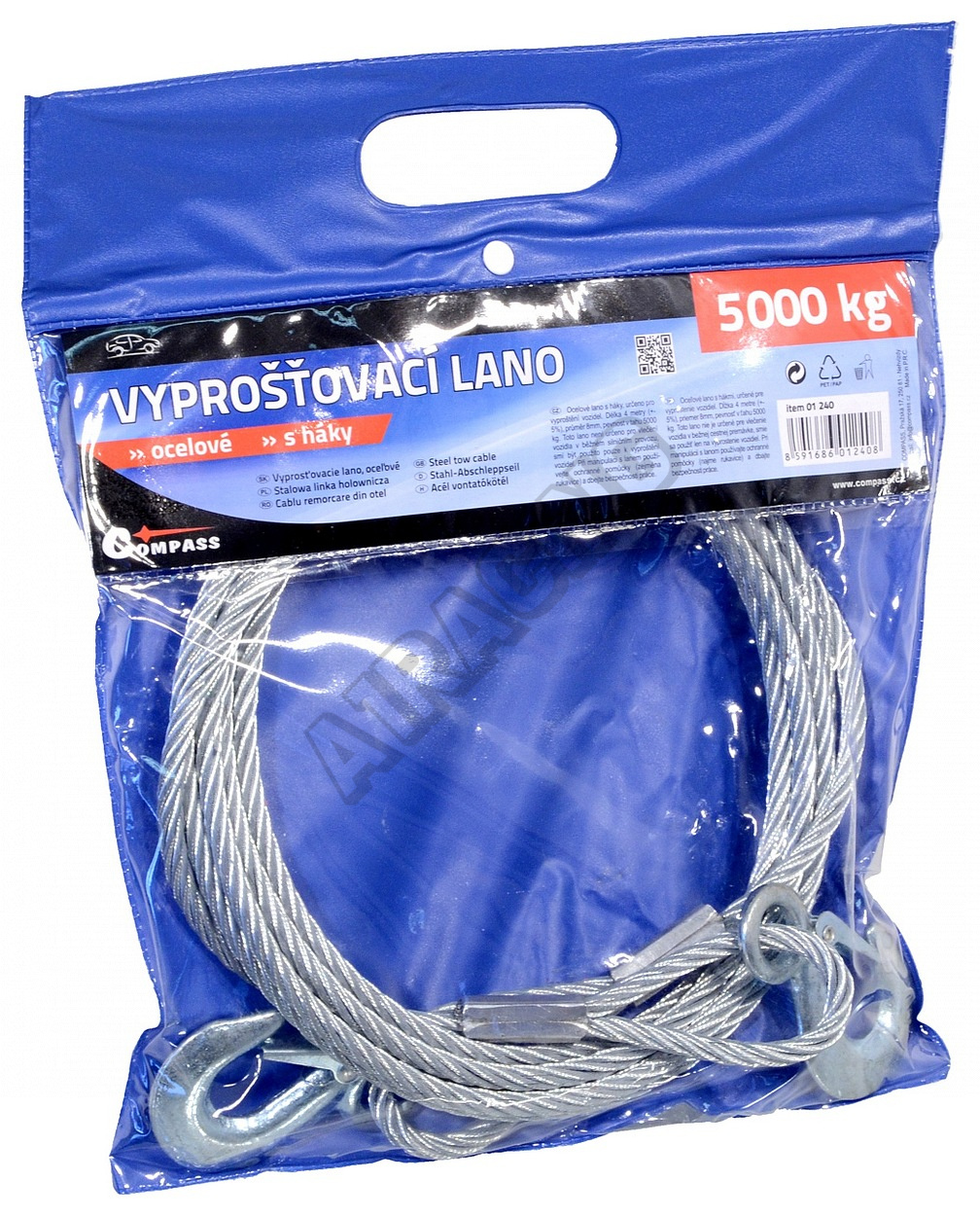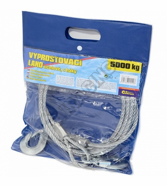 Ocelové lano s háky, určeno pro vyproštění vozidel. Délka 4 metry (+-5%), průměr 8mm, pevnost v tahu 5000 kg.