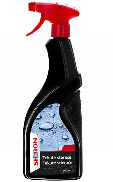 Tekuté stierače 500ml Sheron - rozprašovač. Rain Off je antistatický prípravok, ktorý odpudzuje vodu z čelného skla automobilu. Výrazne zlepšuje viditeľnosť za zhoršených klimatických podmienok, najmä za dažďa, a to aj bez použitia stieračov. Vytvára na sklách automobilov film, vďaka ktorému kvapôčky vody z čelného skla rýchlo skĺznu. V lete znižuje priľnavosť mastných nečistôt aj zvyškov hmyzu a tiež tlmí oslnenia. V zime znižuje tvorbu námrazy a jej priľnavosť na sklách. Rain Off zacelí mikroskopické ryhy na skle a zníži svetelné reflexy na poškriabaných miestach.