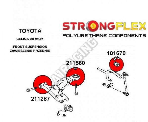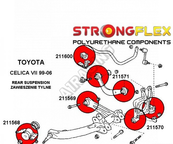 Toyota Celica VII 1999-06 StrongFlex Sport (tvrdost 90ShA) kompletní sestava silentbloků na celé auto obsahuje :
