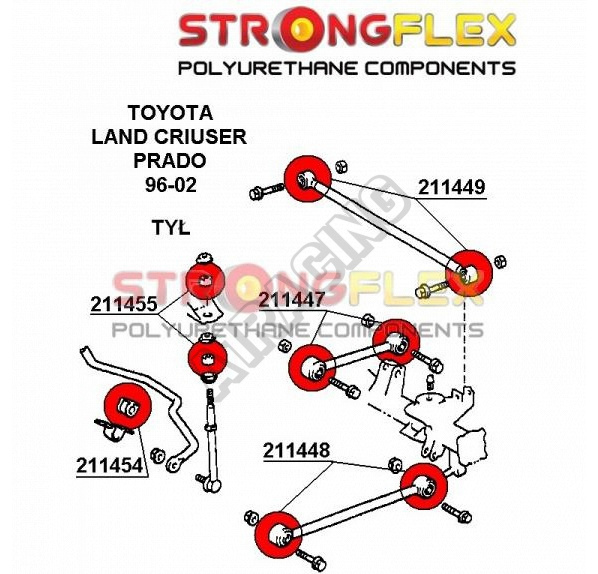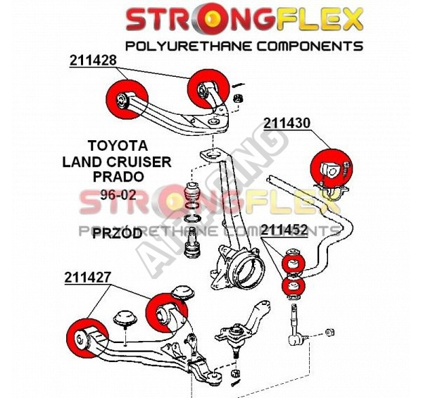 Toyota Land Cruiser StrongFlex Sport (tvrdost 90ShA) kompletní sestava silentbloků na celé auto obsahuje :
