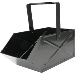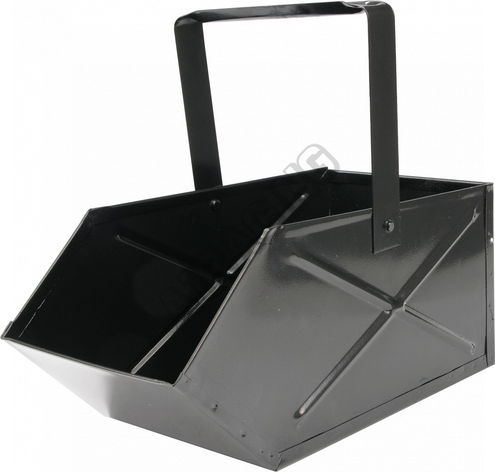 Sklopná rukojeť a šikmá stěna usnadňují vylévání paliva. Užitečné pro provoz kamen na tuhá paliva, krbů a sporáků na uhlí.