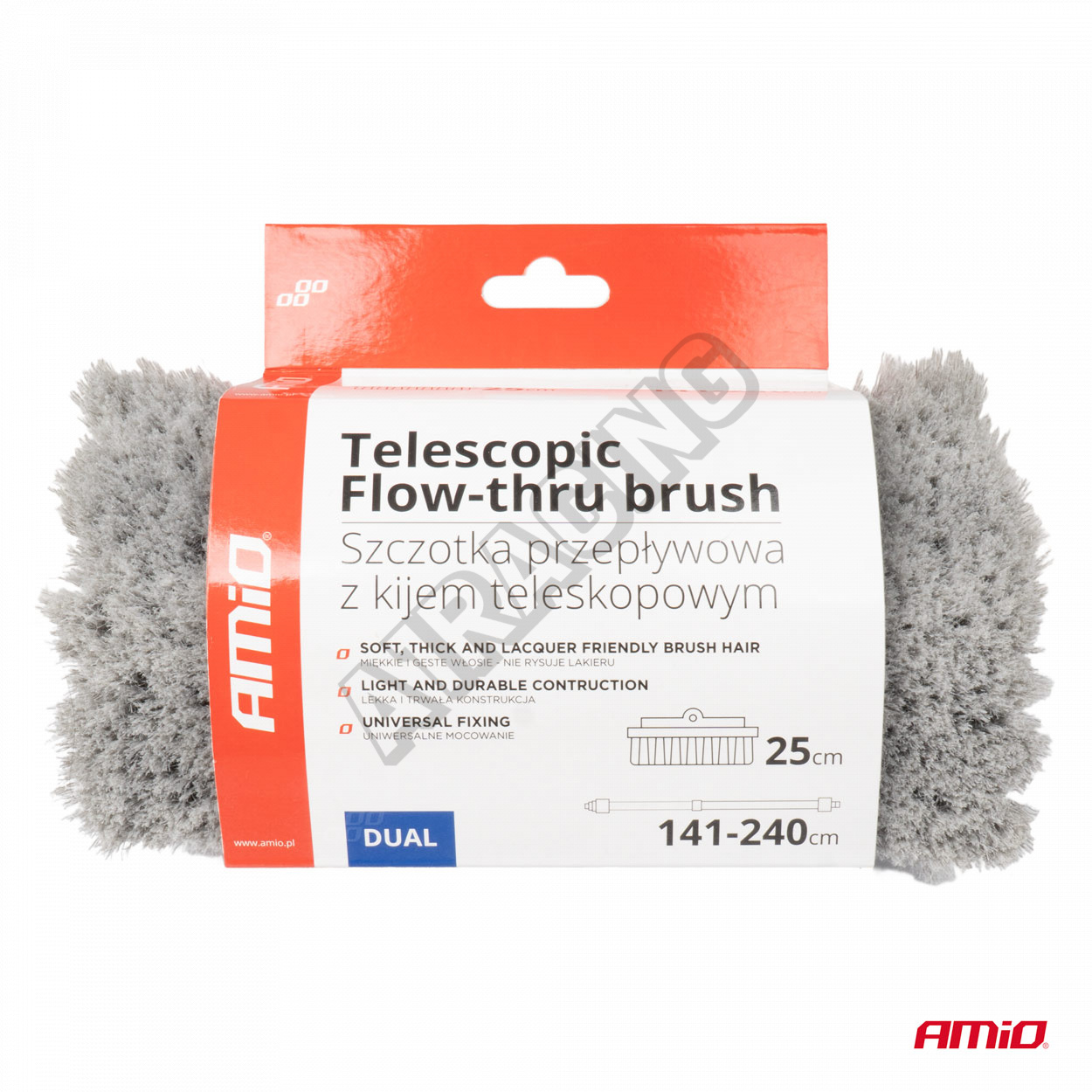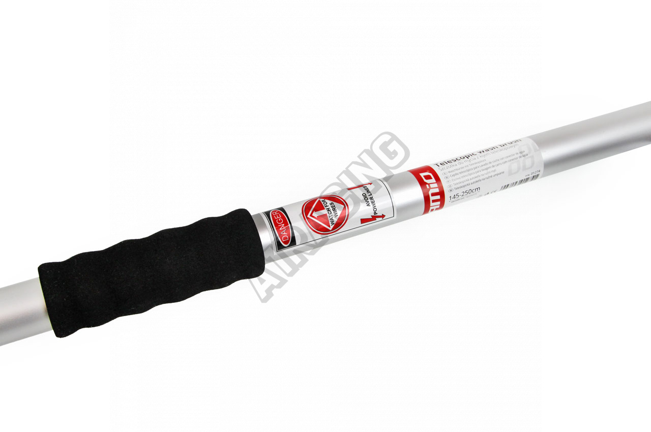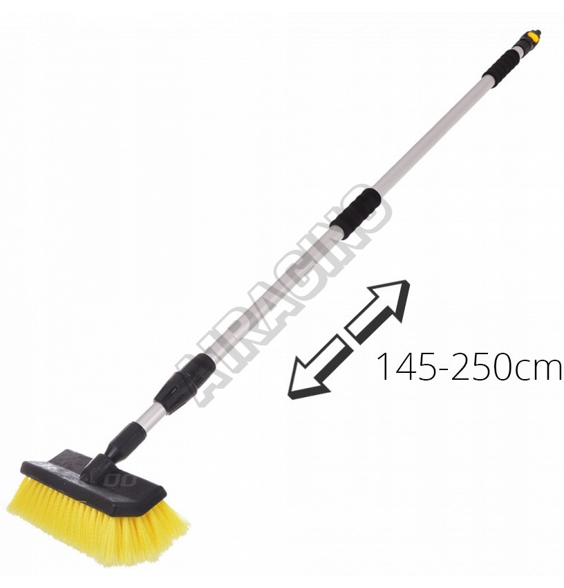 Masívna teleskopická kefa s hliníkovou rukoväťou, nastaviteľná dĺžka od 145 do 260 cm.