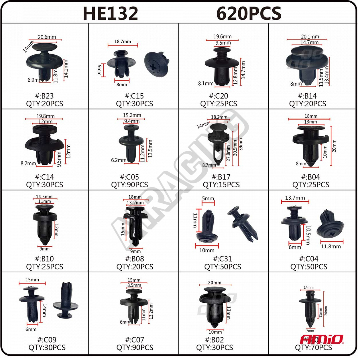 Univerzálna sada rôznych typov plastového uchytenia do auta 16 druhov / 620 ks