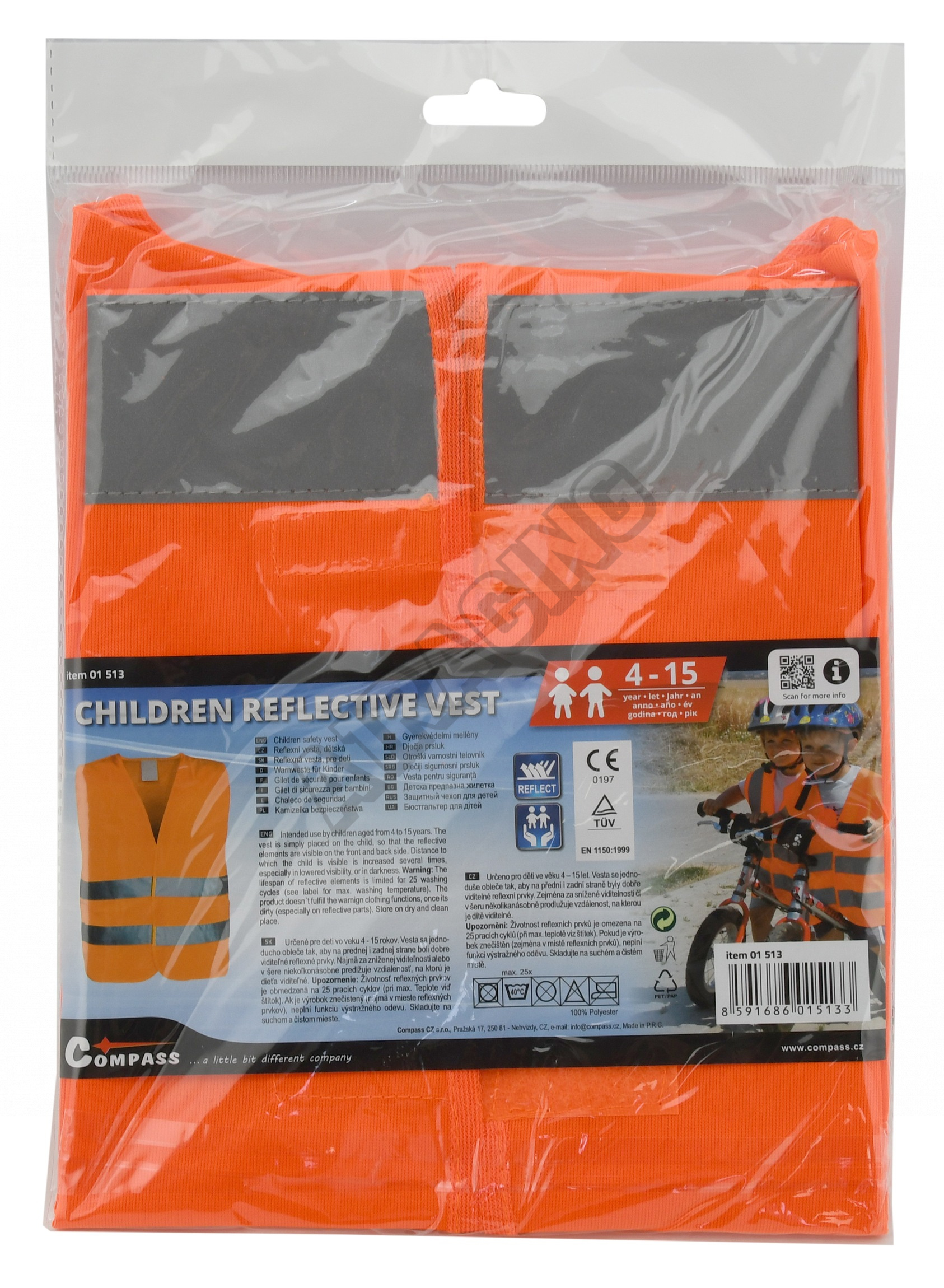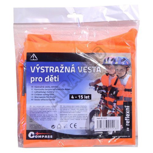 Výstražná reflexní vesta pro děti se zapínáním na suchý zip. Dva reflexní pruhy po celém obvodu, oranžová barva. Určeno pro děti ve věku 4 - 15 let.