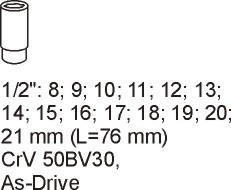 | nástavec 1/2" 76 mm | 8, 9, 10, 11, 12, 13, 14, 15, 16, 17, 18, 19, 20, 21 mm |