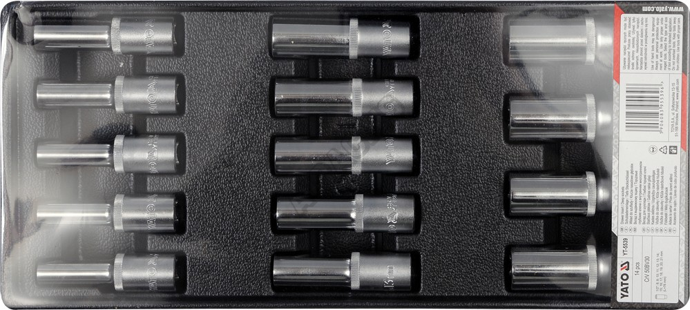 Sada 14 kusů hlubokých nástrčných klíčů z CrV oceli. Sada klíčů je přehledně srovnána ve vložce do zásuvky z PVC.