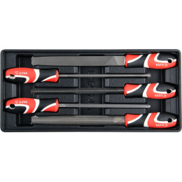 Sada 5 kusů zámečnických pilníků z oceli. Sada je přehledně srovnána ve vložce do zásuvky z PVC.