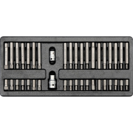 Sada 40 kusů bitů z CrV oceli. Sada bitů je přehledně srovnána ve vložce do zásuvky z PVC.