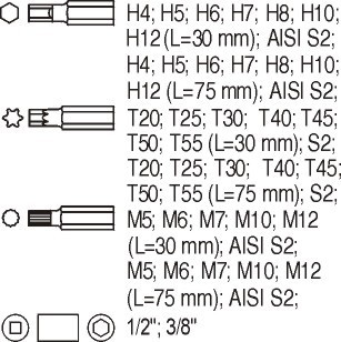 | Bit Torx 75 mm | T20, T25, T30, T40, T45, T50, T55 |