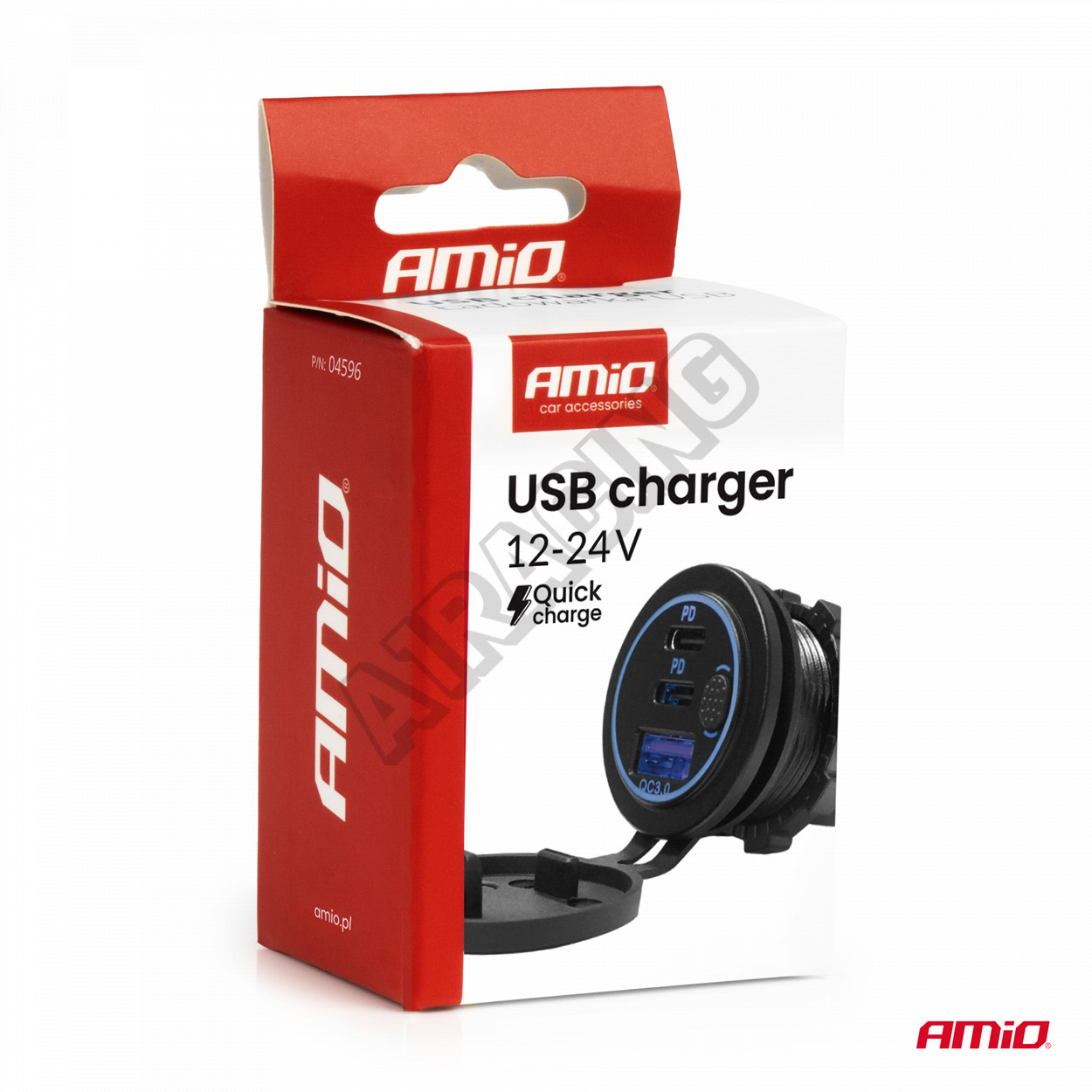 Vodotesná automobilová nabíjačka s USB portami a vypínačom USB + 2x USB-C QC3.0 12V 24V AMIO-04596