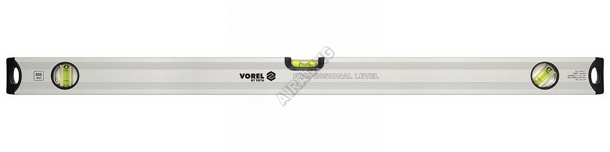 Vodováha vyrobená z eloxovaného hliníkového profilu. Má tři lahvičky pro označení svislého, vodorovn