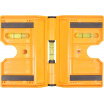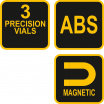 Tělo je opatřeno 3 libelami pro přesné umístění konstrukčních prvků. Gumový pásek je vhodný pro uchycení na dřevo nebo beton, další součástí jsou 4 magnety pro uchycení na kov.