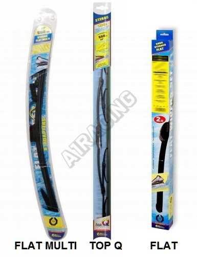 Stěrače FLAT SET (sada 2 ks na celé auto). Vysoce kvalitní pružný člen plochého stěrače zajišťuje stejnoměrný tlak grafitového břitu v celé jeho délce, což zamezuje rozmazávání nečistot a vytváření pruhů.