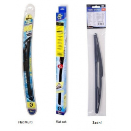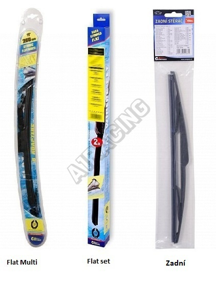Stěrače FLAT SET (sada 2 ks na celé auto). Vysoce kvalitní pružný člen plochého stěrače zajišťuje stejnoměrný tlak grafitového břitu v celé jeho délce, což zamezuje rozmazávání nečistot a vytváření pruhů.