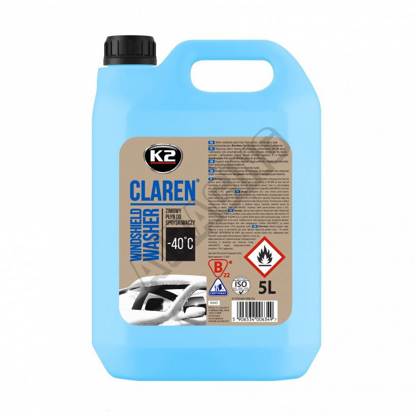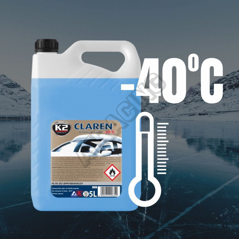 Kvapalina do ostrekovačov K2 CLAREN -40°C je úplne bezpečná pre laky, gumené prvky a plasty, taktiež pre najmodernejšie svetlomety vyrobené z polykarbonátu. Chráni lišty stieračov pred stratou pružnosti. Je možné použiť pre všetky typy trysiek ostrekovačov. Účinne ich chráni pred mrazom.