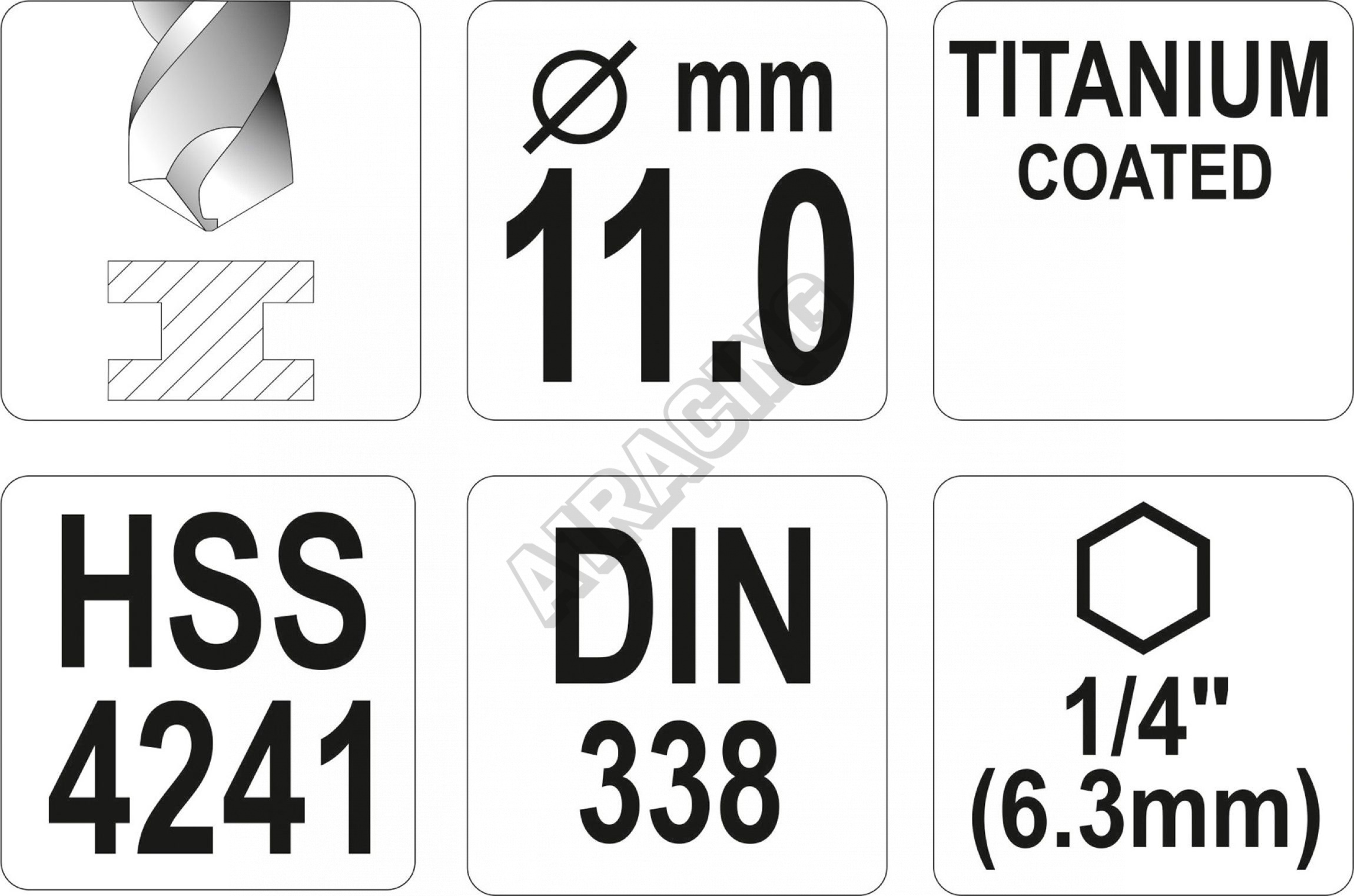 Vyrobeno z rychlořezné HSS oceli s Titanovým povlakem a vrcholovým úhlem 135°. Vrták je opatřen HEX 1/4" uchycením.