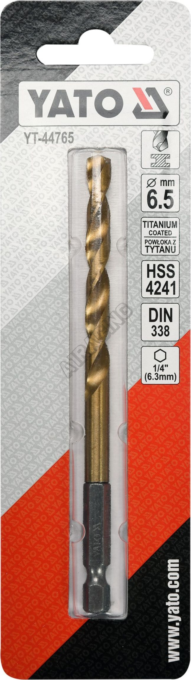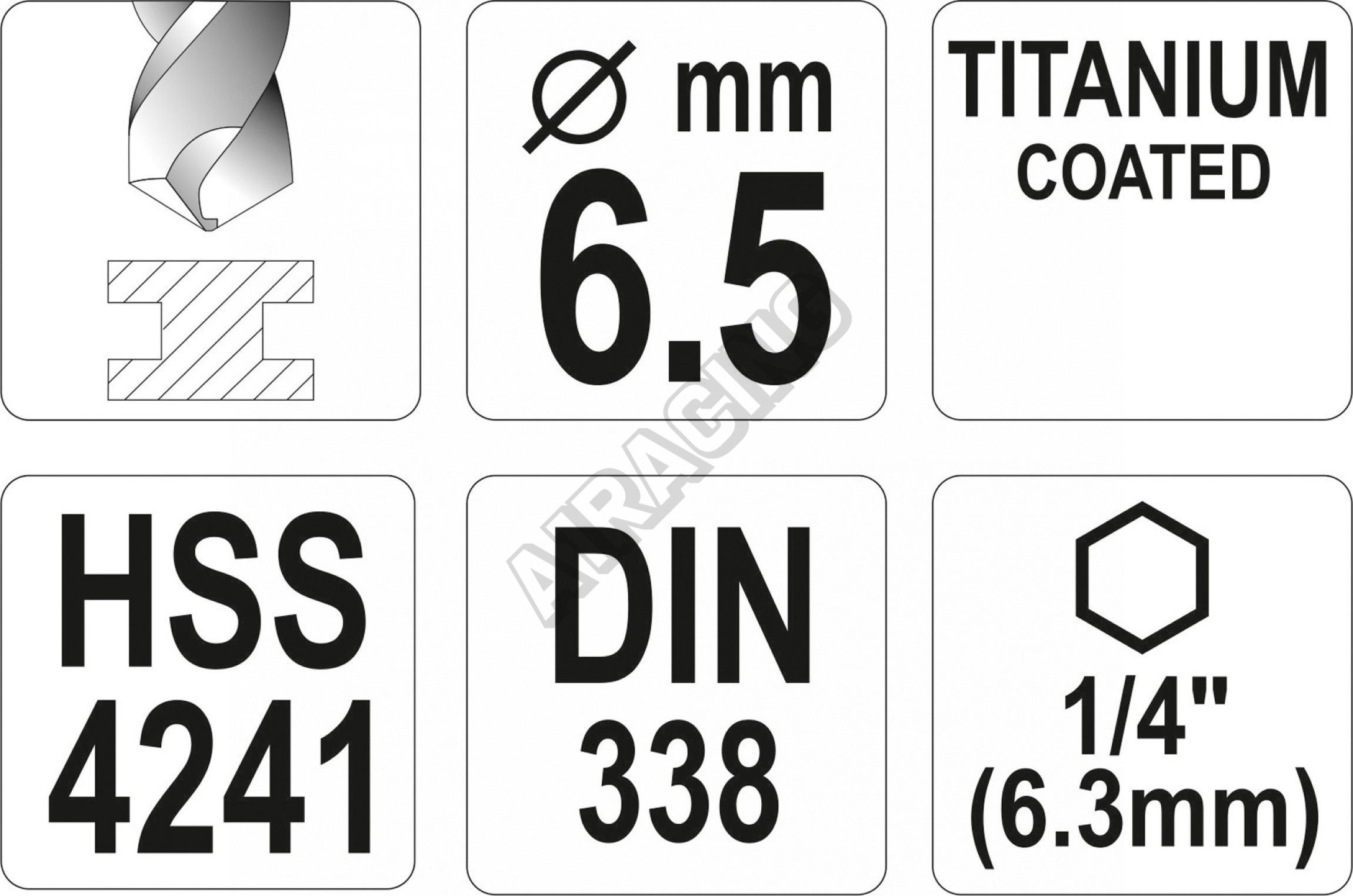 Vyrobeno z rychlořezné HSS oceli s Titanovým povlakem a vrcholovým úhlem 135°. Vrták je opatřen HEX 1/4" uchycením.