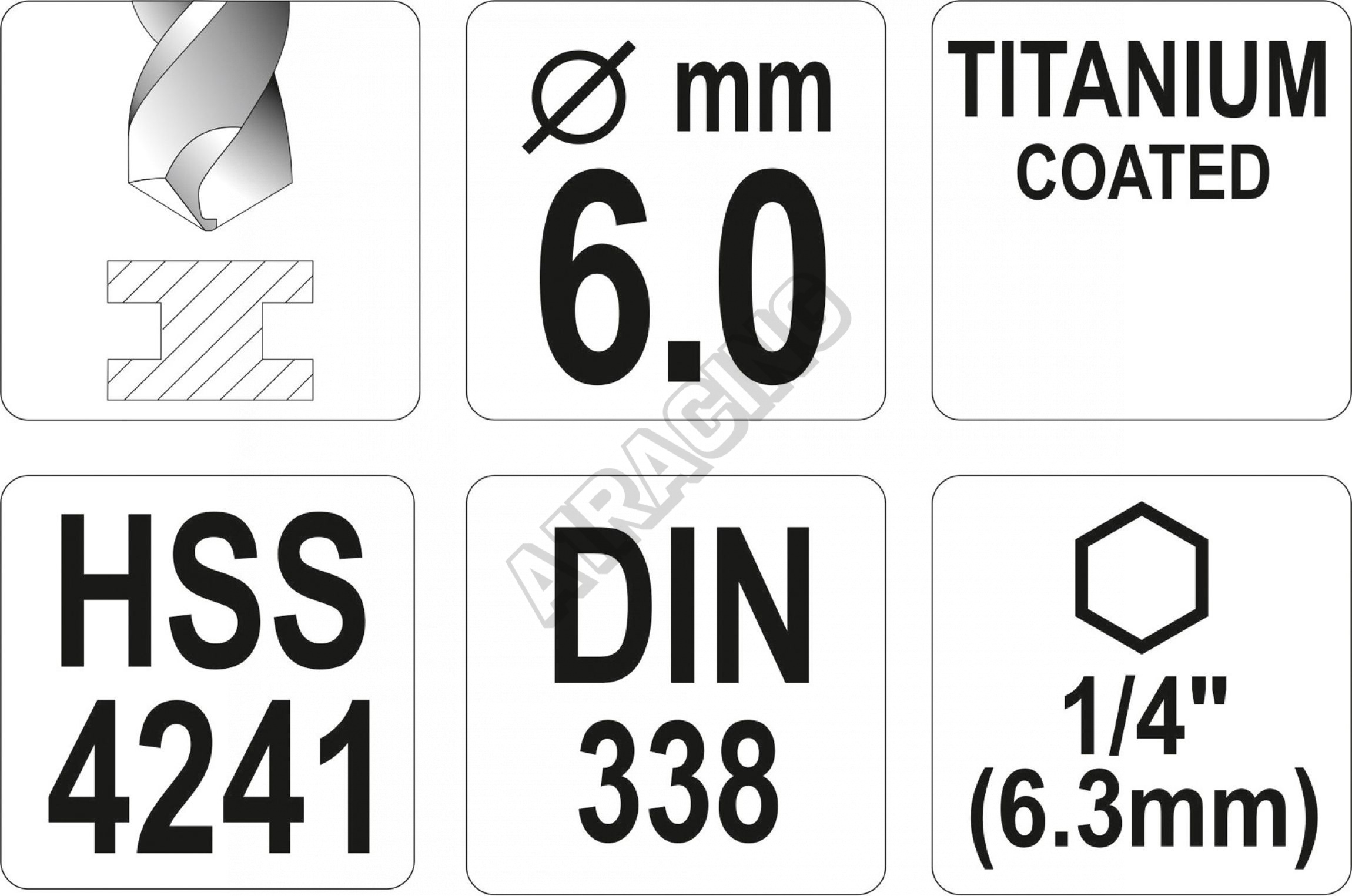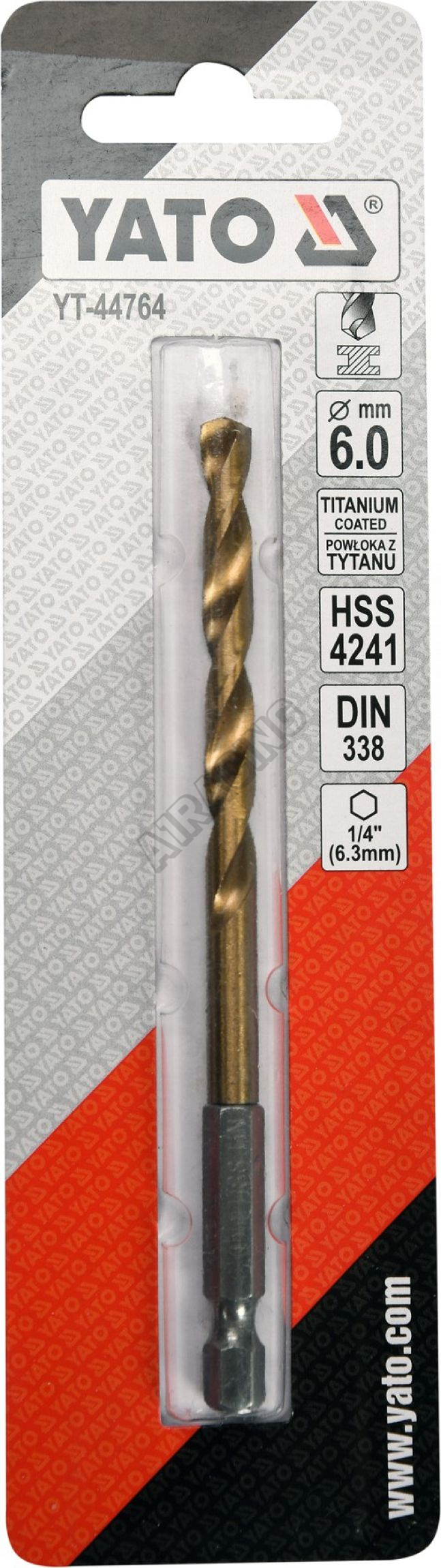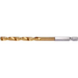 Vyrobeno z rychlořezné HSS oceli s Titanovým povlakem a vrcholovým úhlem 135°. Vrták je opatřen HEX 1/4" uchycením.