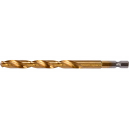 Vyrobeno z rychlořezné HSS oceli s Titanovým povlakem a vrcholovým úhlem 135°. Vrták je opatřen HEX 1/4" uchycením.