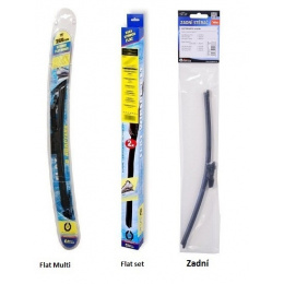 Stěrače FLAT SET (sada 2 ks na celé auto). Vysoce kvalitní pružný člen plochého stěrače zajišťuje stejnoměrný tlak grafitového břitu v celé jeho délce, což zamezuje rozmazávání nečistot a vytváření pruhů.