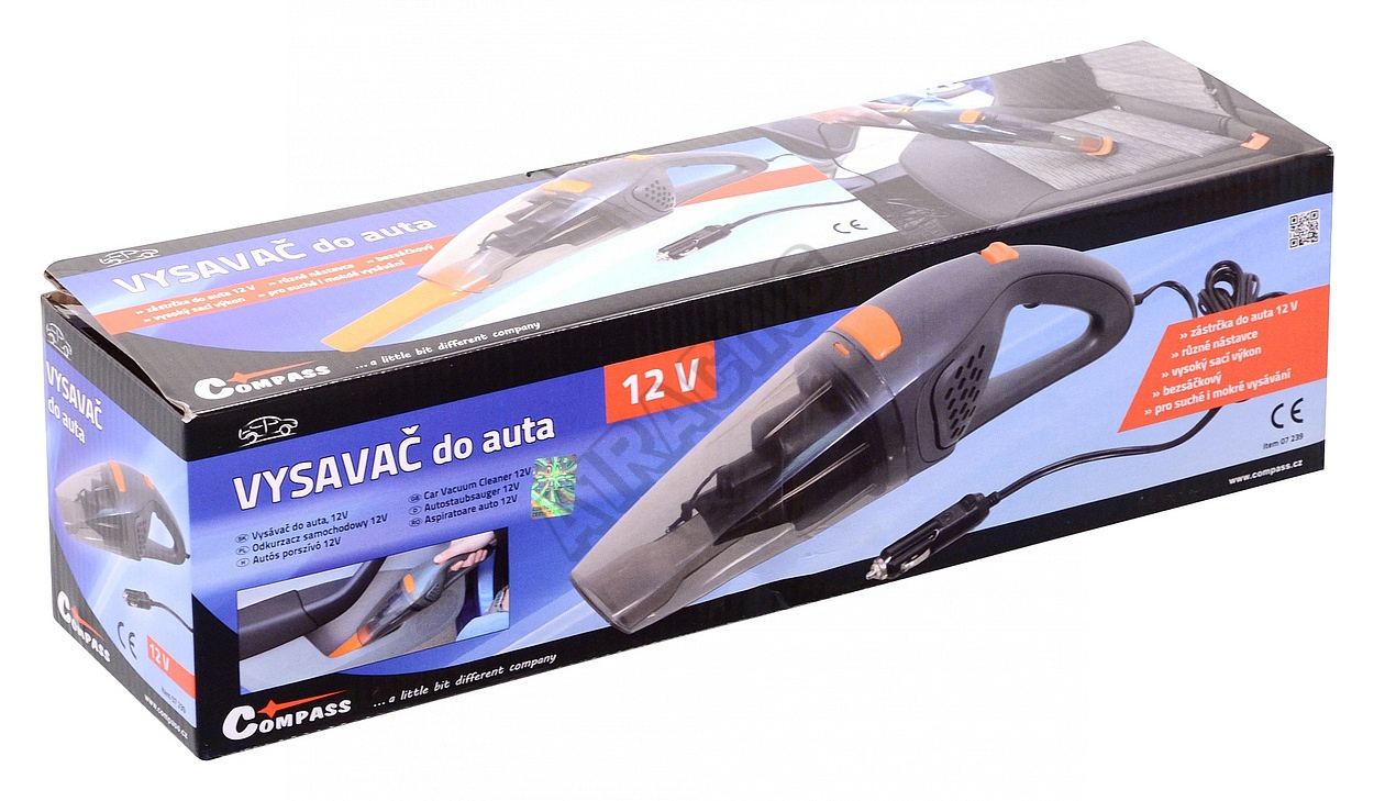 Prenosný vysávač, vybavený dlhým káblom a so zástrčkou do zásuvky automobilového zapaľovača 12V.