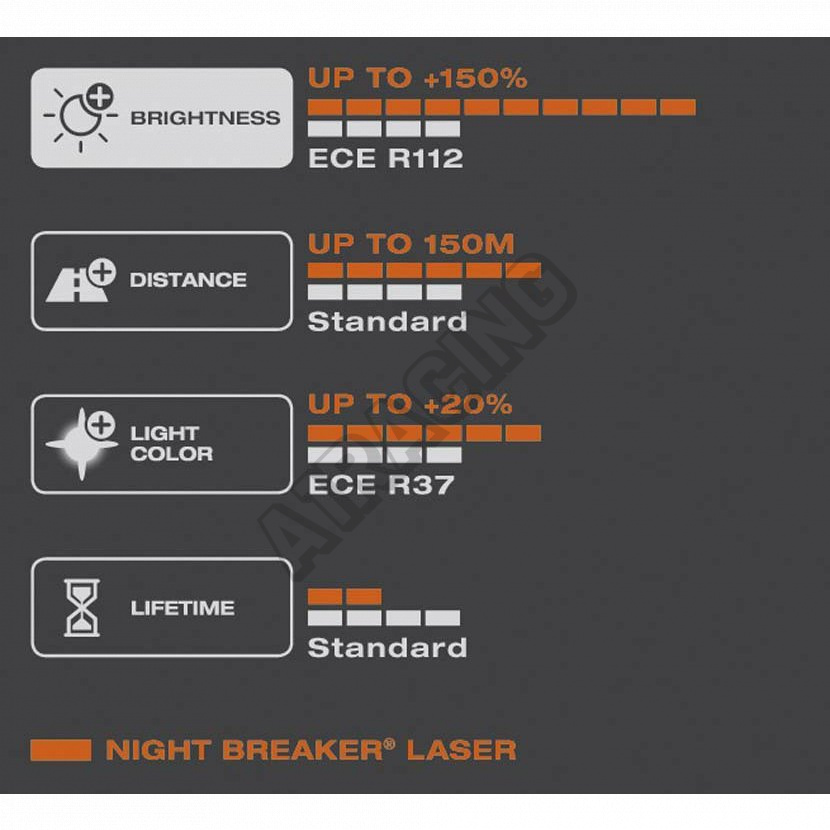 Vďaka technológii laserovej ablácie svietia tieto halogénové svetlomety NIGHT BREAKER LASER až o 150% jasnejšie. Dokonalé vlákno zaisťuje vynikajúce jasné svetlo. V dôsledku toho poskytujú tieto autožiarovky Osram Night Breaker až 150 m dlhý lúč a až o 20% belšie svetlo v porovnaní s minimálnym zákonným štandardom. Viac svetla a lepšia viditeľnosť môžu vodičom pomôcť rýchlejšie identifikovať a reagovať na dopravné riziká a predísť tak nehode. V neposlednom rade: OSRAM NIGHT BREAKER LASER presvedčí svojim jedinečným dizajnom (laserom gravírovaný názov produktu) a kompletným portfóliom (H1, H3, H4, H7, H8, H11, HB3, HB4).