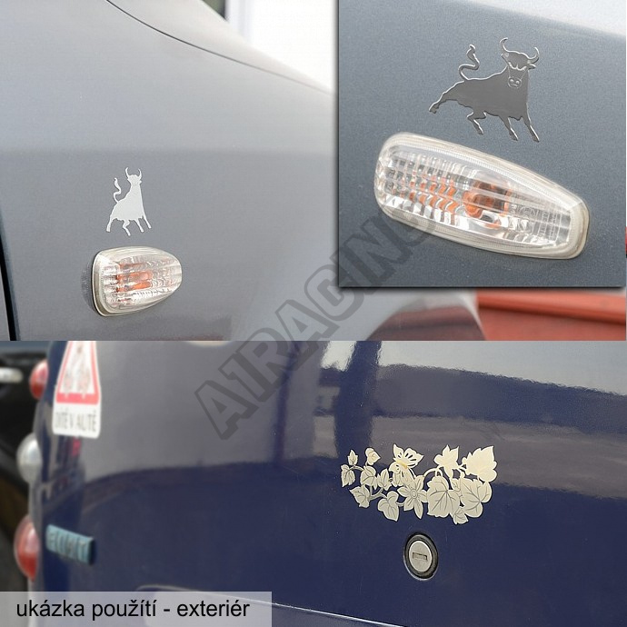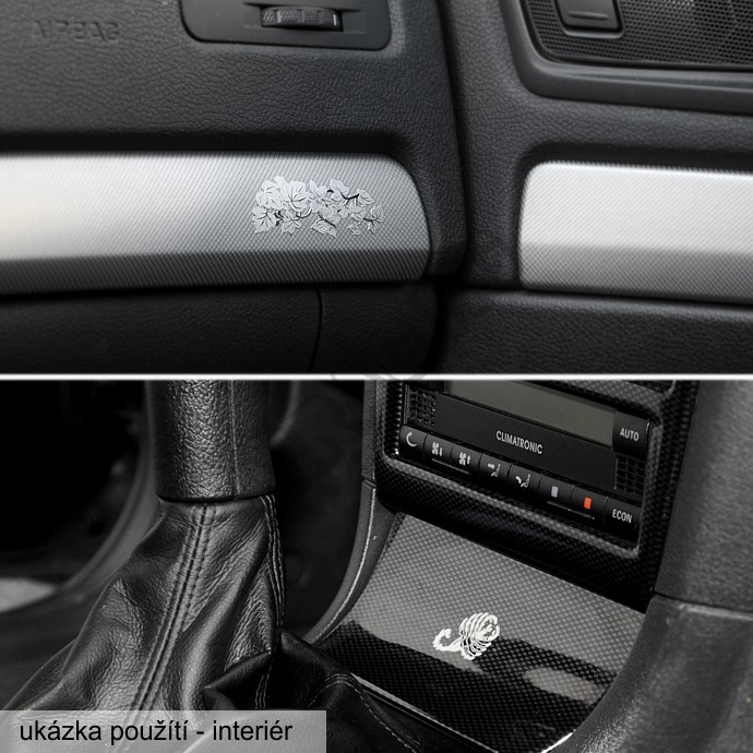 Samolepící kovová dekorace s lesklou povrchovou úpravou v kombinaci s jemným gravírováním. Elegantní doplněk automobilu - snadné nalepení. Vhodné i jako doplněk interiéru vozu.