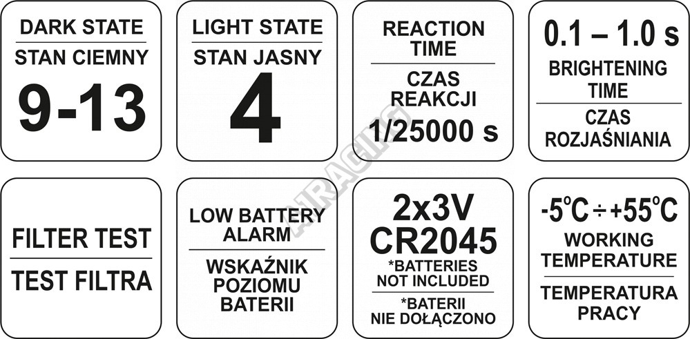 Doba rozjasnenia 0,1-1,0 s., doba stmavenia 0,3-0,8 ms. Filter navyše poskytuje ochranu proti UV/IR lúčom na úrovni DIN16. Prilba má plynulé nastavenie citlivosti a stmievania, rovnako ako postupné prispôsobenie rýchlosti stmievania.