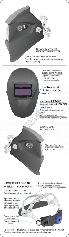 Zváračská kukla s automaticky stmavujúcim filtrom. Vysoko kvalitný filter vybavený 4 oblúkovými senzormi poskytuje zorné pole 98*43 mm, DIN 9-13 tmavý stav, DIN4 svetelný stav, doba odozvy 1/25000 s.